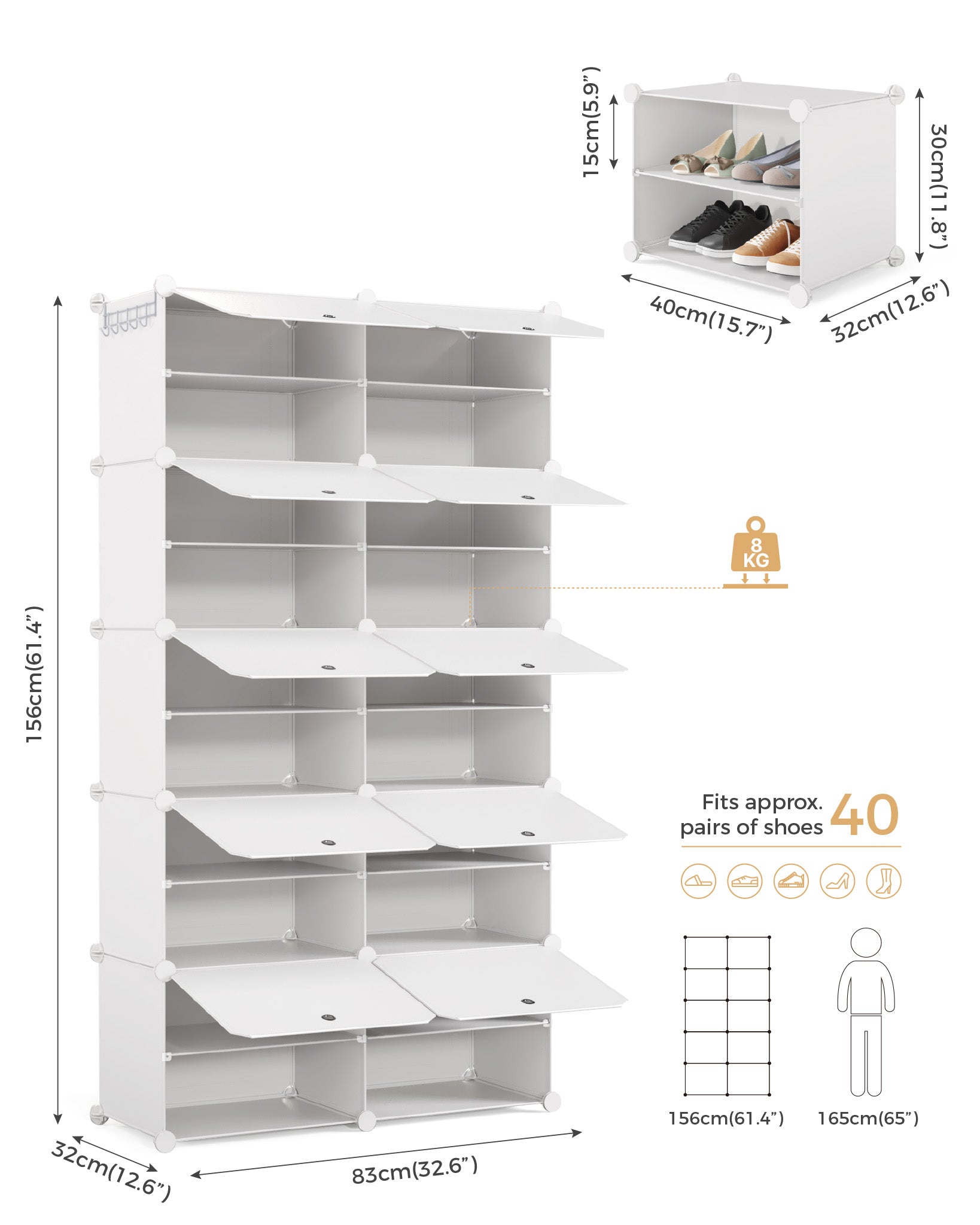 Mondeer Shoe Storage Cabinet, 2 x 10 Tier Modular Plastic Shoe Rack for 40 Pairs Shoes, Cube Shoe Organizer with Removable Shelf and Hooks, for Hallway Entryway Closet, White